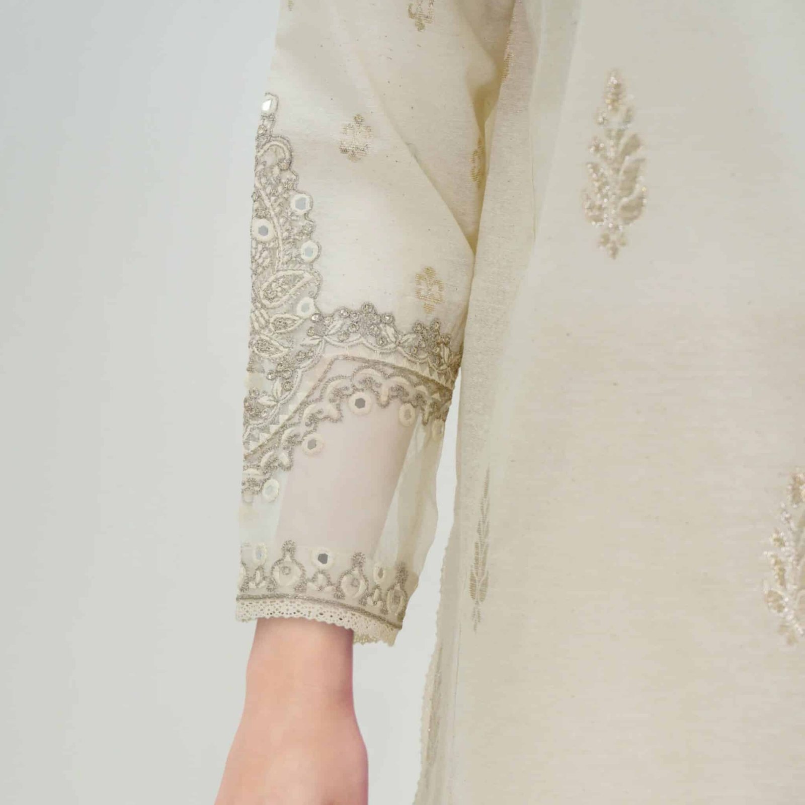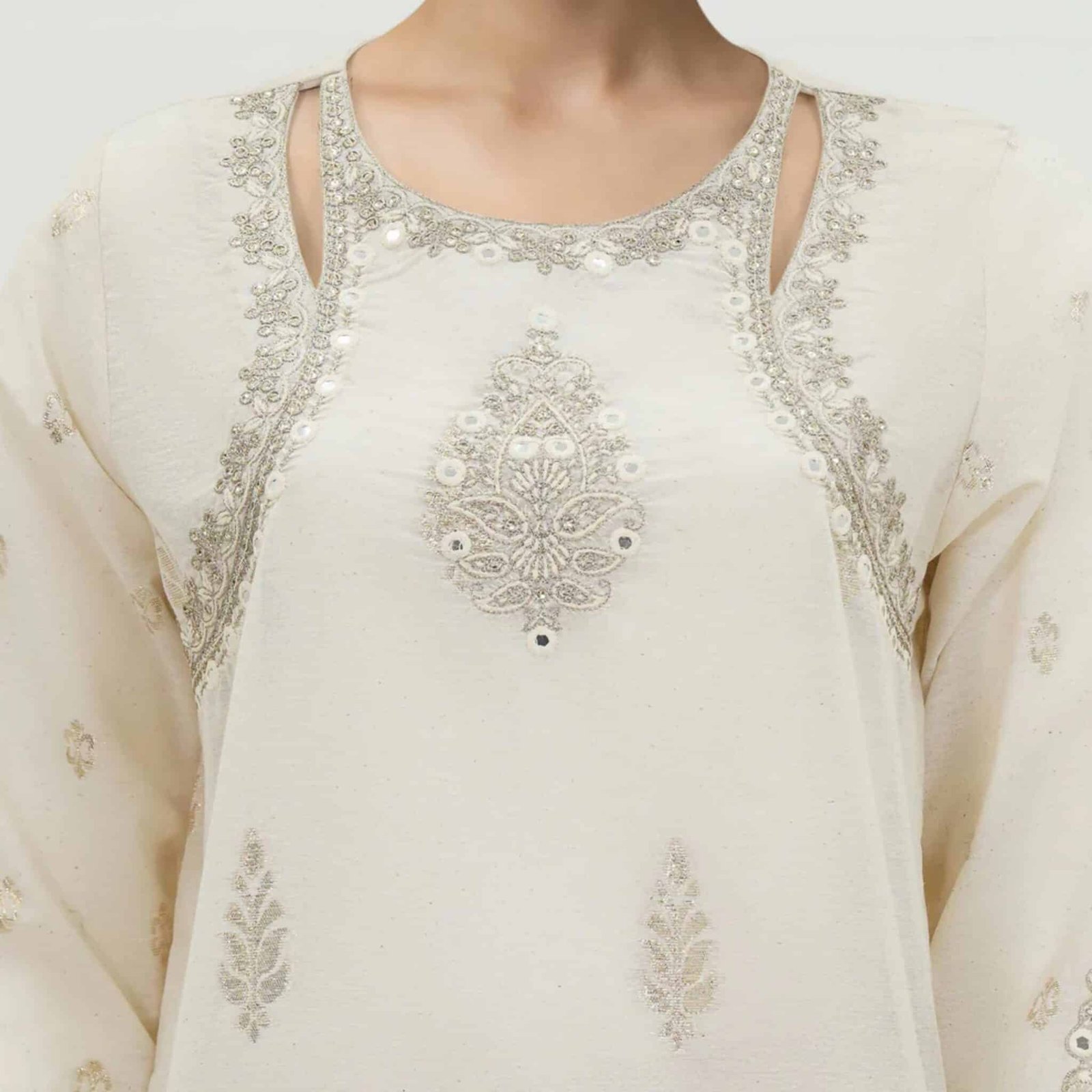 - Mirror, tilla, and thread embroidered shirt with a round neckline and cut-out